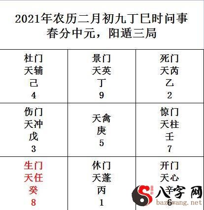 值使随时随地宫,丁巳时,寅落艮八宫,卯落九宫,辰落一宫,巳落二宫。故值使生门落二宫。